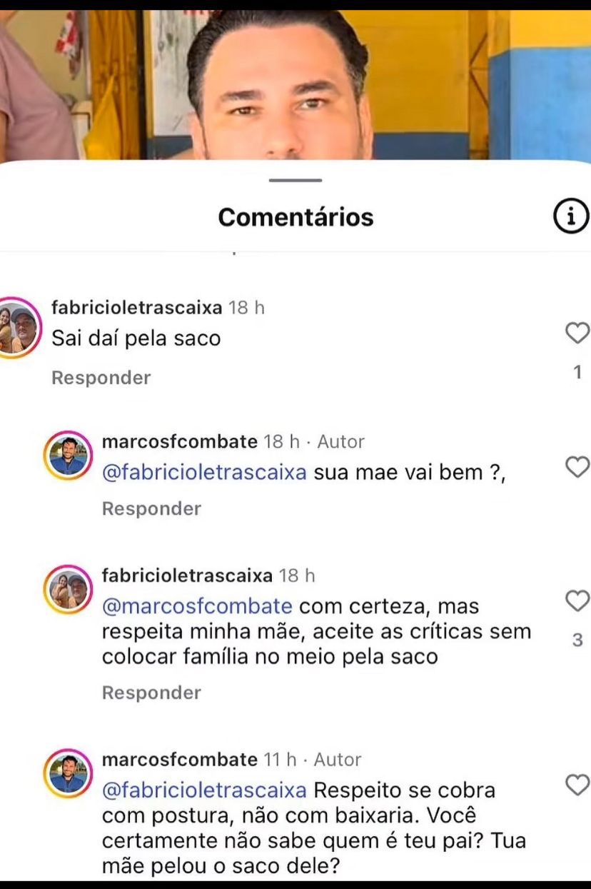 O episódio mais recente ocorreu após um usuário comentar de forma crítica uma publicação do vereador. Em resposta, Marcos Combate rebateu com ironia envolvendo a mãe do seguidor e, posteriormente, questionou a identidade do pai do internauta, afirmando: “Tua mãe pelou o saco dele?”
