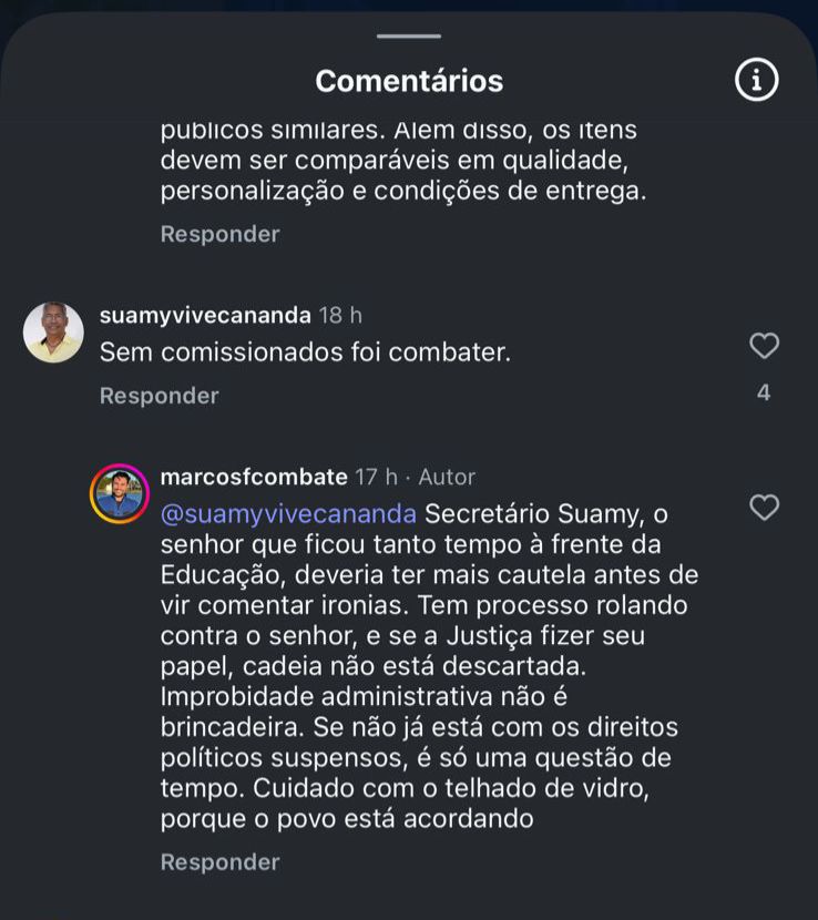 Em outro comentário, publicado diretamente em resposta a uma manifestação do ex-secretário estadual de Educação, Suamy Vivecananda, o vereador voltou a adotar tom agressivo. Ele mencionou processos judiciais e sugeriu que o ex-gestor poderia ser preso por improbidade administrativa, afirmando que “se a Justiça fizer seu papel, cadeia não está descartada”.