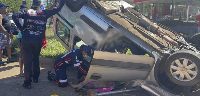 Com o impacto, o Fiat Strada capotou no meio da via e ainda atingiu um ciclista que passava pela área no momento da batida.