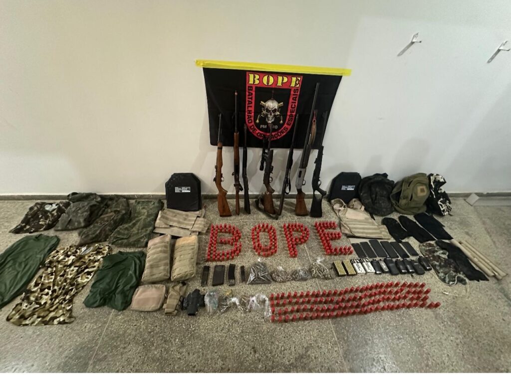 No local, os policiais encontraram fuzis calibre 7.62, carabinas, rifles, espingardas calibre 12 e munições intactas e deflagradas. Também foram recolhidos rádios comunicadores, celulares, motocicletas com registro de furto e roubo, além de estruturas defensivas como guaritas em árvores e barricadas de madeira.