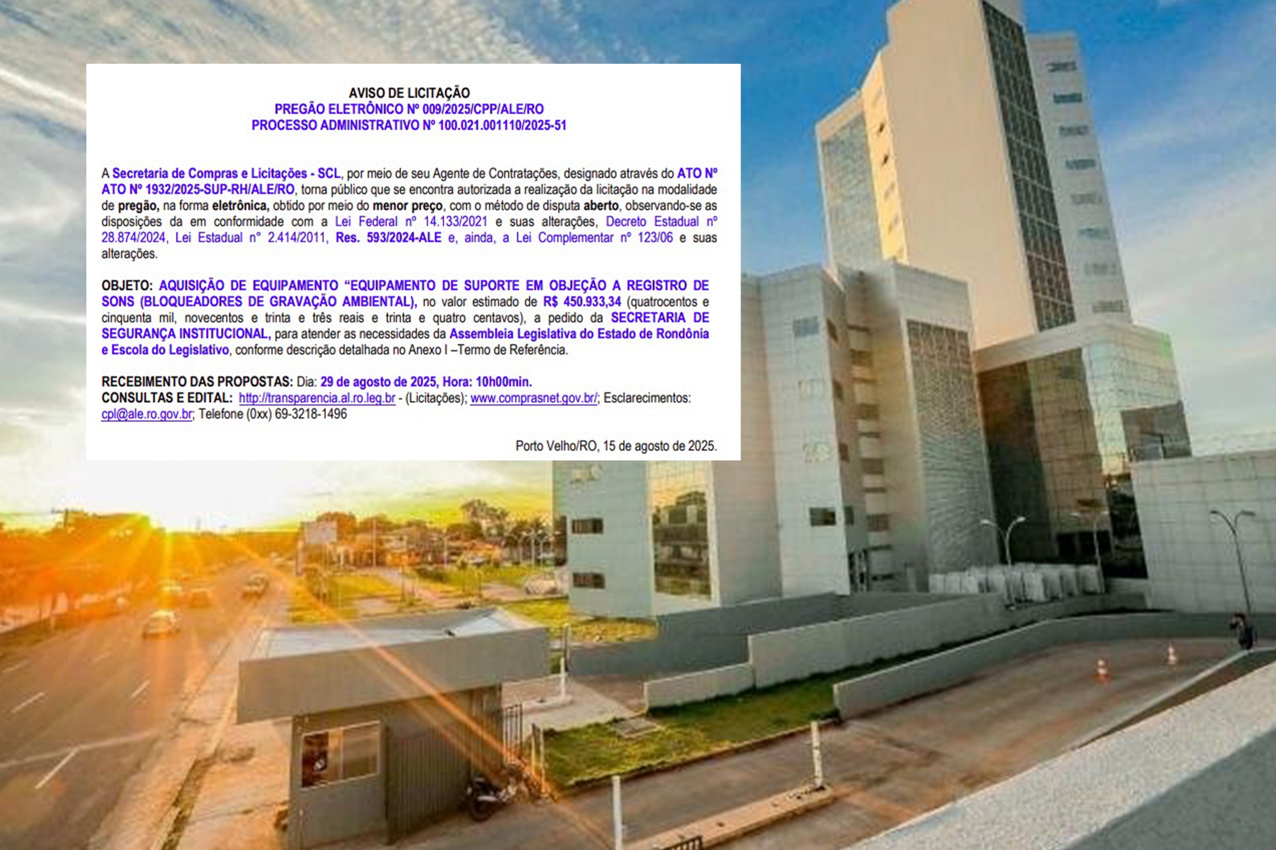 PORTAL RIO MADEIRA – A Assembleia Legislativa de Rondônia (ALE/RO) abriu processo para aquisição de dois bloqueadores de gravação ambiental, aparelhos que utilizam ondas ultrassônicas para impedir o registro de conversas em reuniões e gabinetes. O investimento, estimado em R$ 450.933,34, consta no Termo de Referência nº 0387125/2025-ALE/SEC-SEG-INS, elaborado pela Secretaria de Segurança Institucional (SSI).