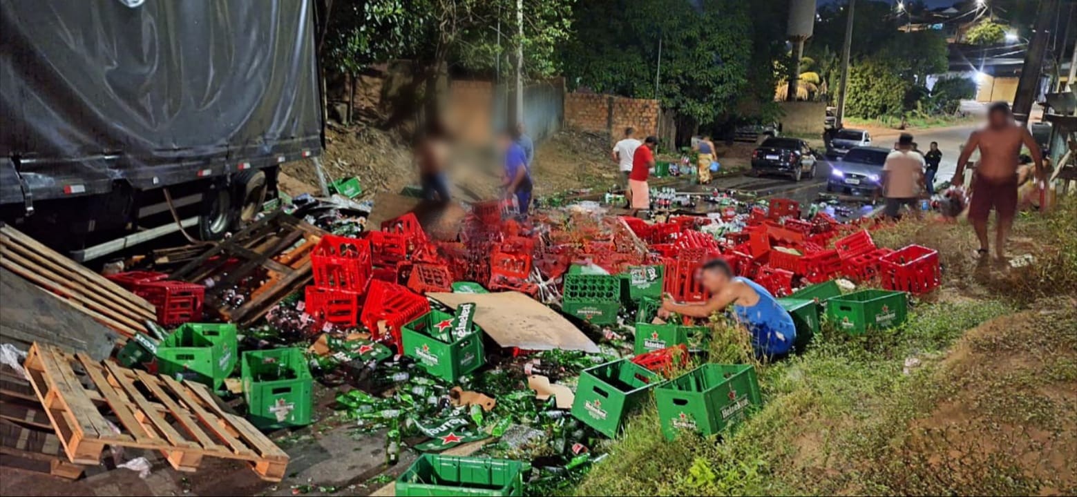 Carreta carregada com bebidas tomba em Porto Velho e população leva produtos espalhados pela via