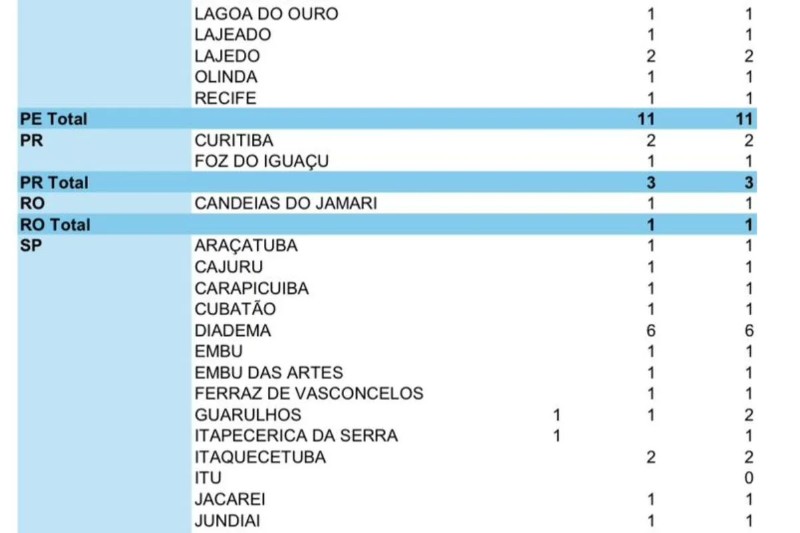 Também há registros em Goiás (2), Paraná (3), Bahia (2, com um óbito em apuração), Rio Grande do Sul (2), Minas Gerais (1), Mato Grosso (1), Piauí (1), Rio de Janeiro (1), Paraíba (1) e Distrito Federal (1).
