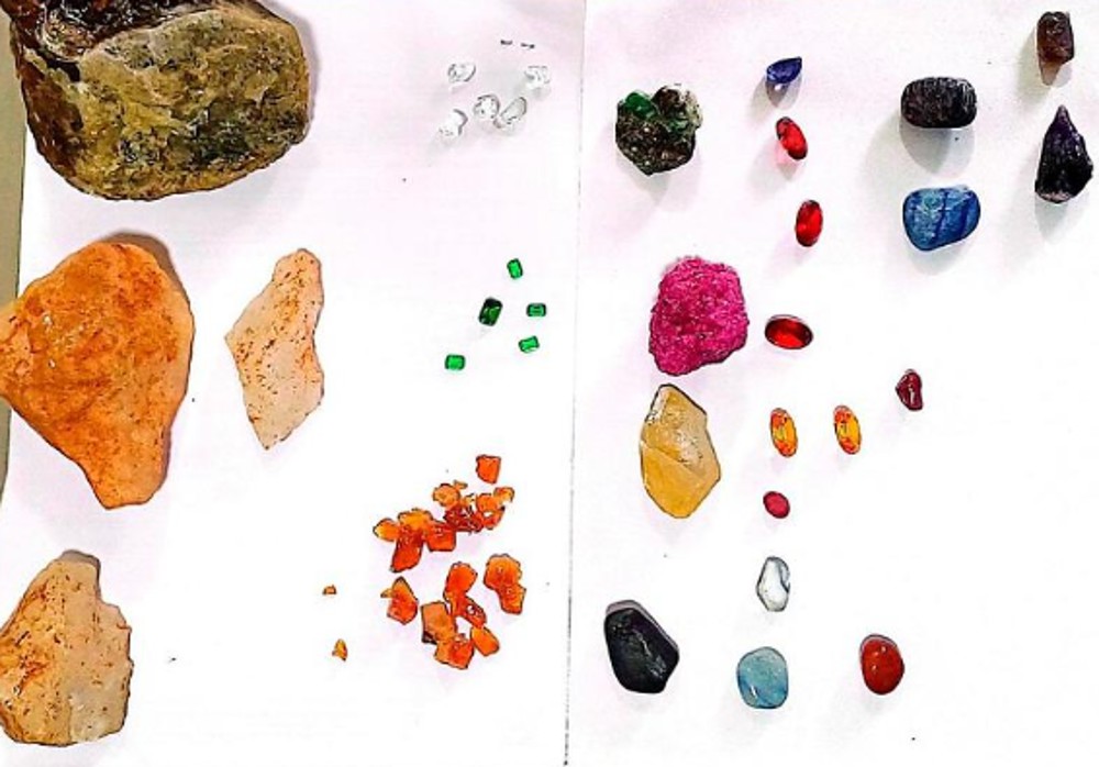 Em seguida, os agentes localizaram outras 66 pedras escondidas dentro de um utensílio doméstico. Entre os materiais apreendidos estavam rubis, esmeraldas, ametistas, safiras, citrinos, turmalinas, diamantes e outras pedras ainda não identificadas.