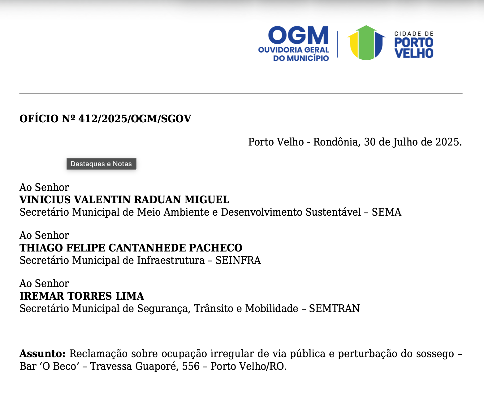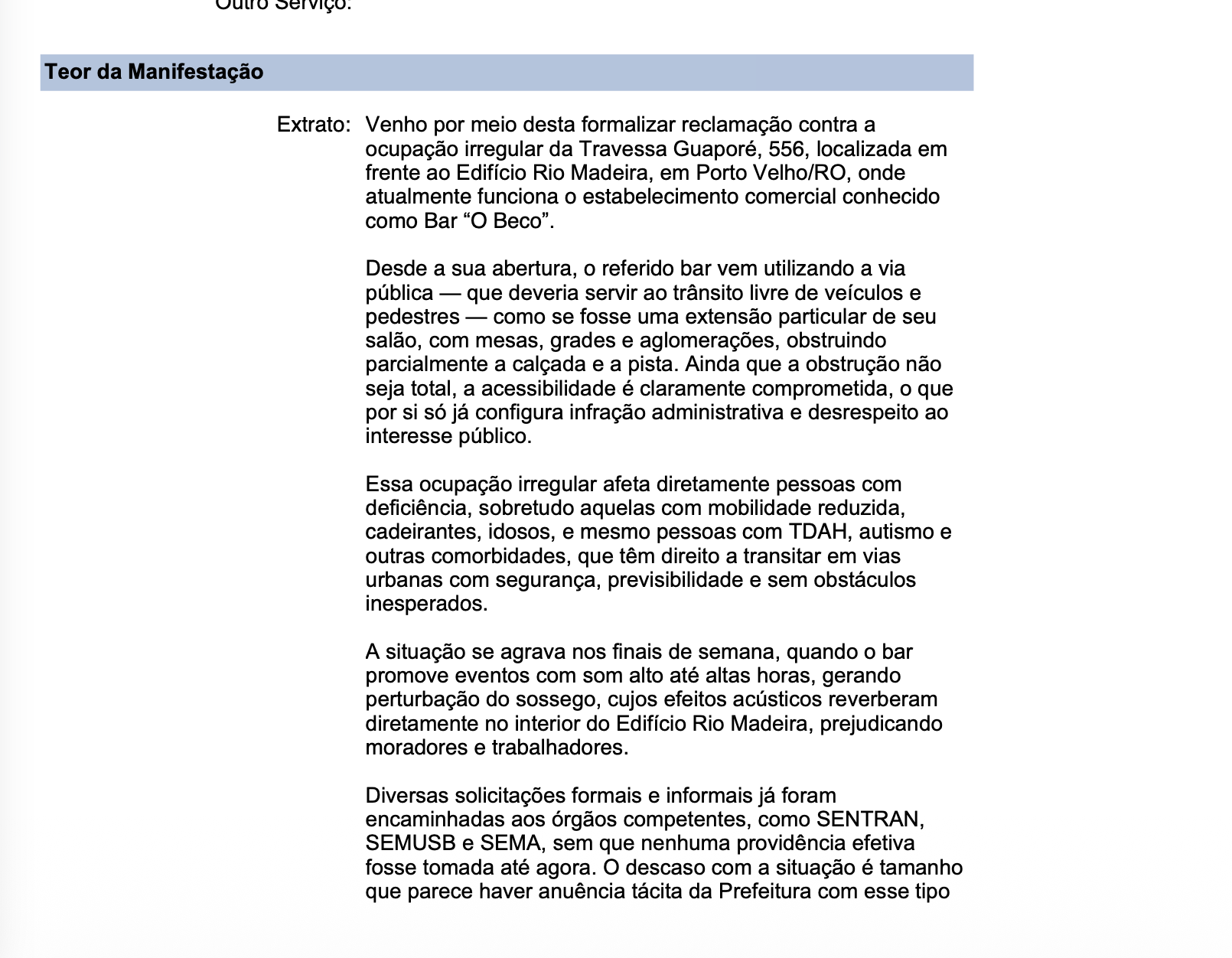 Os moradores afirmam ter registrado denúncias e pedidos de fiscalização junto à SEMUSB (Posturas), SEMTRAN, SEMA, SESDEC, SMETRAN e Ouvidoria-Geral do Município, além de comunicações ao Ministério Público de Rondônia.