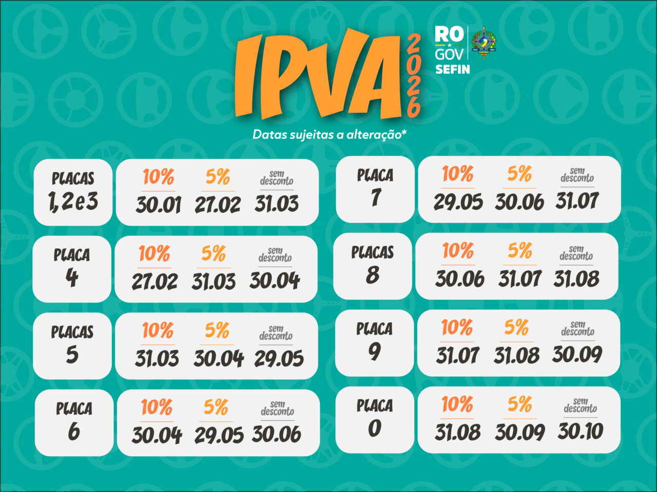 PORTAL RIO MADEIRA – O governo de Rondônia, por meio da Secretaria de Estado de Finanças (Sefin), divulgou o calendário de pagamento do IPVA 2026, com prazos escalonados conforme o número final da placa dos veículos.