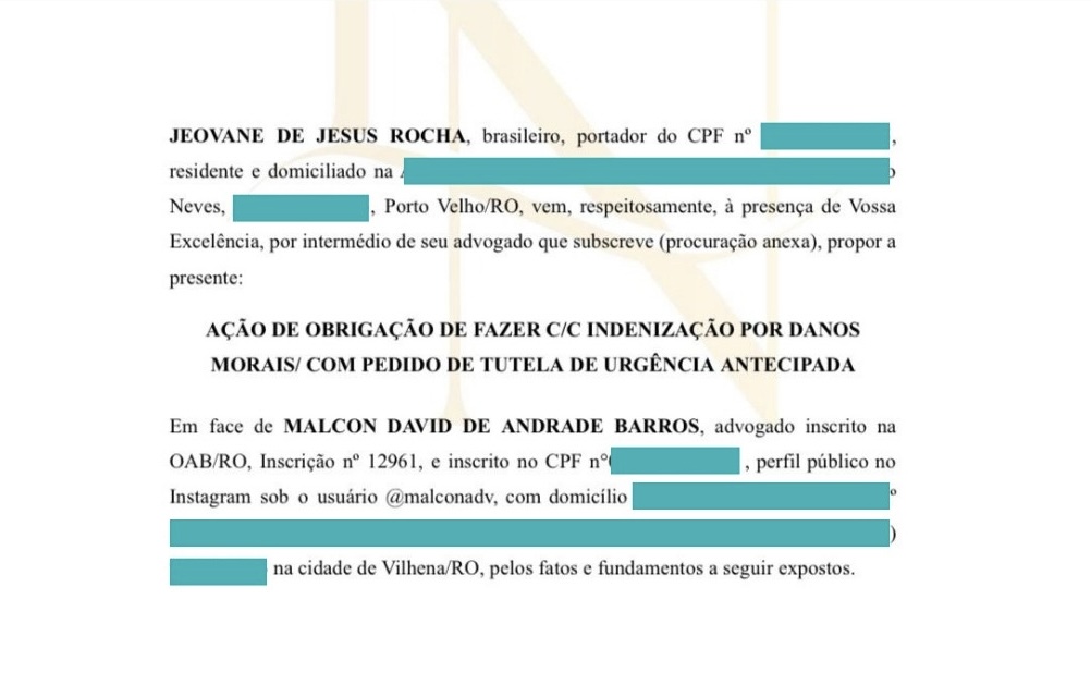 Na ação, a defesa de Jeovane Ibiza requer indenização por danos morais no valor de R$ 10.000,00, além da exclusão do vídeo publicado por Malcon Andrade. O documento aponta que as declarações teriam atingido a honra e a imagem do vereador, com possível repercussão em sua atuação política.