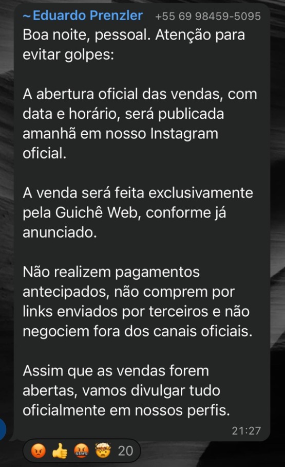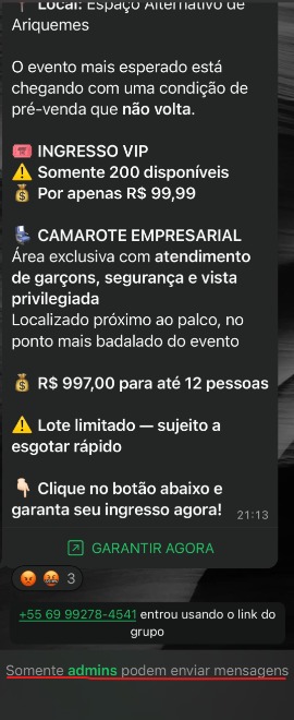 Ainda assim, um número desconhecido conseguiu enviar um anúncio de pré-venda de ingressos contendo valores compatíveis com o evento, descrição detalhada e um link para compra, o que conferiu aparência de legitimidade à publicação.